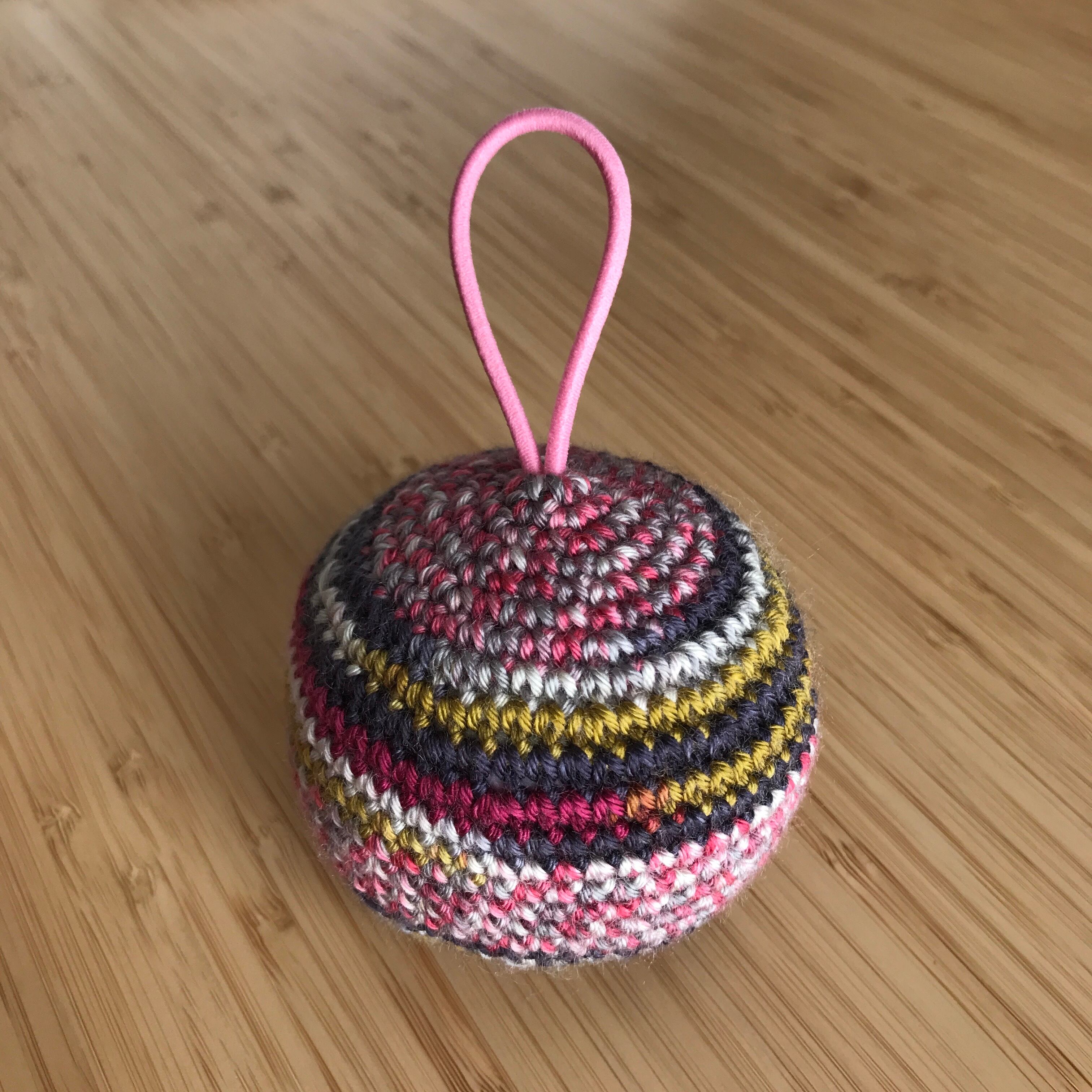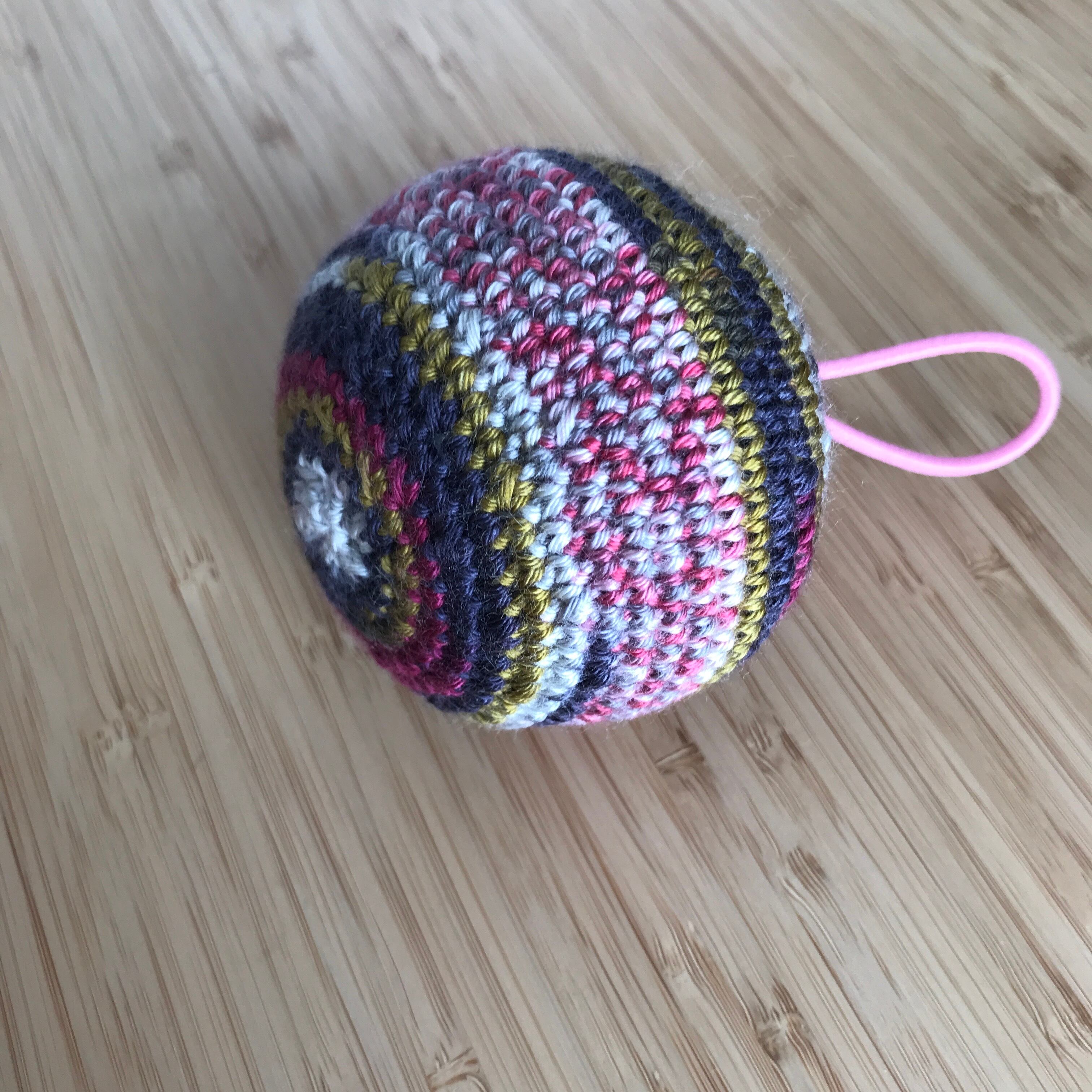 コットンで編み上げたボールの中にクッションを入れ、